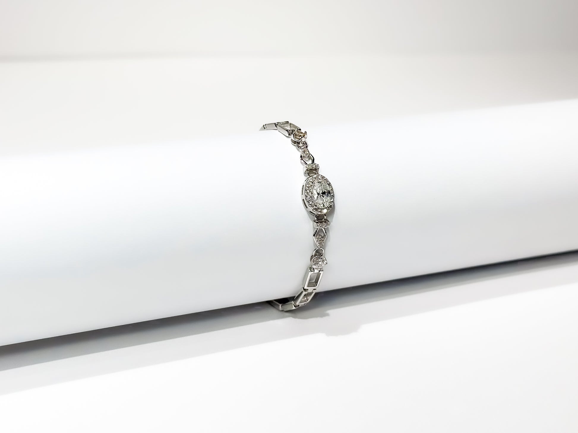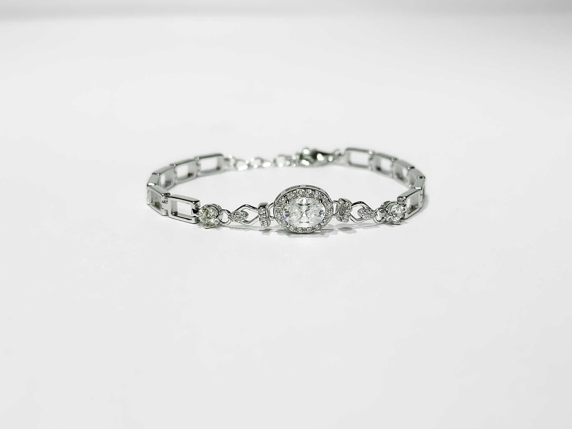 Radiating elegance with every glance, the Celeste Bracelet features a captivating oval-cut moissanite centerpiece surrounded by shimmering accents. Its modern link design adds a touch of sophistication while maintaining timeless charm. Crafted in premium sterling silver with a rhodium finish, Celeste is the perfect statement of grace and brilliance — ideal for both everyday wear and special occasions.
